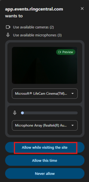 You may see a prompt asking for permission to access your microphone and camera. Simply click ‘allow while visiting the site’ to enable these devices.