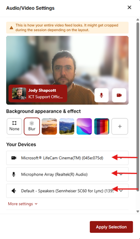 If you need to change your default camera, microphone, or speaker, you can do so. After making your selection, click Apply Selection to join the session.