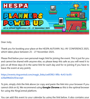 First things first, make sure you've booked your place via our website. Once that's done, keep an eye on your inbox. Closer to the event you'll receive an email (see image below) with your personal link to join the event. This link is just for you, so please don’t share it.