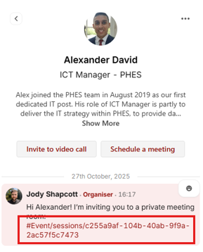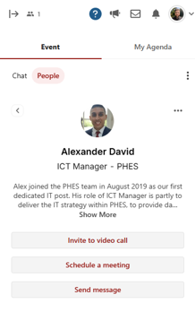 Check out the People panel to see who’s attending. Click on someone’s name to view their profile, send a message, or invite them to a video call.