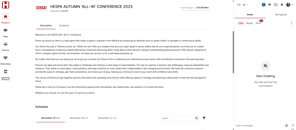 The schedule is your roadmap. You’ll find it on the reception page, broken down by day. It will show you what's coming up next and help you to choose which Stages and Sessions to attend. Stages are typically used for keynote speeches or large presentations, while Sessions are usually smaller, interactive discussions such as workshops or roundtables.