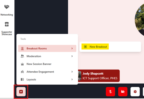 To create breakout rooms, click the icon in the bottom-left corner, select Breakout Rooms, and then click New Breakout.