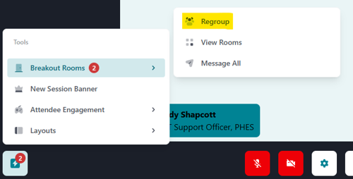 You will automatically regroup when the time is up, alternatively regroup at any time by clicking the icon in the bottom-left corner, selecting Breakout Rooms, and then Regroup.