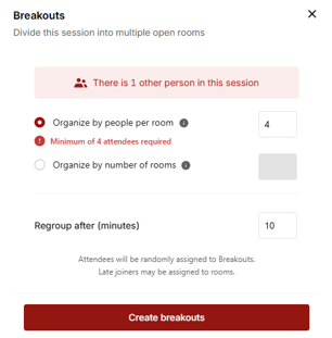 Enter your desired settings and then click Create breakouts. The delegates will be automatically assigned to their rooms.