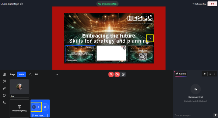 After joining the event, click the second 'backstage link' we emailed you. This takes you to the backstage area for your session.