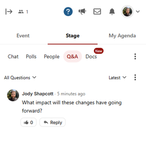 Delegates will see your video and presentation in the middle of the page, and interact via chat and polls on the right.